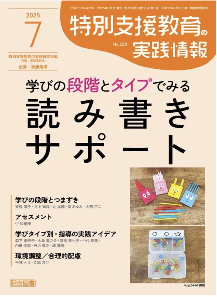 わたくし自身は、かな文字の書きの発達の段階とそれぞれにみられるつまずきについて紹介する機会をいただきました。この特集では、さまざまな先生が読み書きの学びの段階別につまずきがわかりやすく解説してくださっており、読みやすいものとなっております。ご依頼いただきました関係者の皆様に深く感謝を申し上げます。詳しくは出版社サイトもしくは購入サイトより。